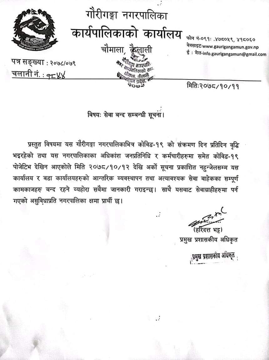 नगरपालिकाका प्रमुख प्रशासकीय अधिकृत हरिदत्त भट्टद्वारा हस्ताक्षरित सूचनामा माघ १२ देखि अर्को सूचना जारी नहुन्जेलसम्मका लागि अत्यावश्यक बाहेकका सेवा बन्द गरिएको उल्लेख छ ।